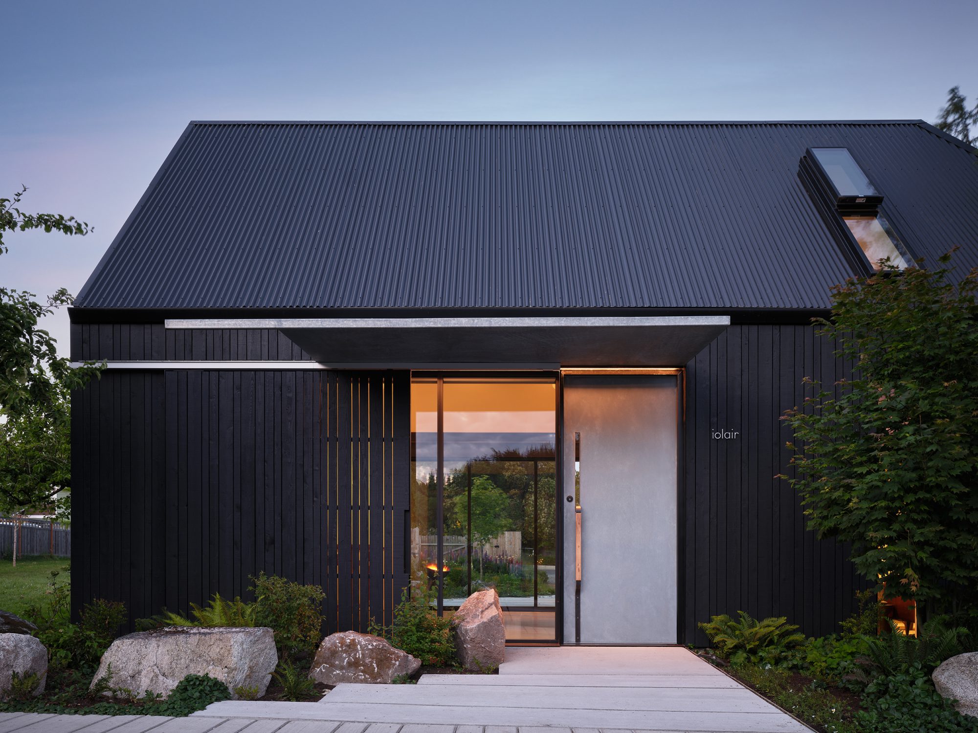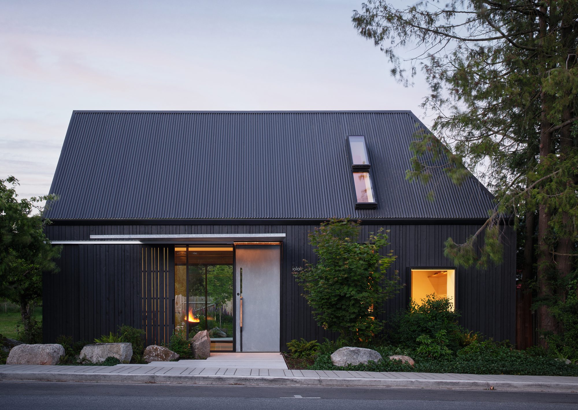 From the exterior, the building reads as a carved mass, a solid form that has been sculpted around the requirements of its use. Clad in ebony-stained cedar planks, the east carved covered workspace is highlighted with a white-stain using the same planks. This treatment mirrors the white walls of the gallery and residence inside. The roofline of the building is formed to follow the transition from public to private space, with the height adjusting as a reflection of this. Despite its compact footprint, the building accommodates multiple functions: a working loft above the gallery, a small kitchen for both resident artist and public events, separate public and private bathrooms, and a secluded sleeping room for the artist-in-residence.