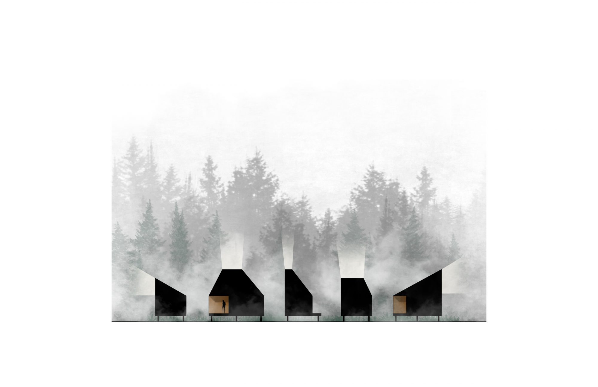 Menizei sits at the northernmost edge of the Olympic Peninsula looking out over a two-hundred-foot bluff to the Salish Sea and Strait of Juan de Fuca. The location offers unique access to the Olympic National Park and proximity to beautiful Lake Crescent. The project program combines both residential and commercial uses and consists of a main cabin, and multiple tent sites with bath houses that include a sauna, shower, and small water closet. The architectural response limits the removal of trees by placing the main cabin on a previously developed building pad and weaving pathways and tent sites into the existing forest. The bath house structures touch the earth lightly with diamond pier foundation systems that allow the platforms to float above the flora.